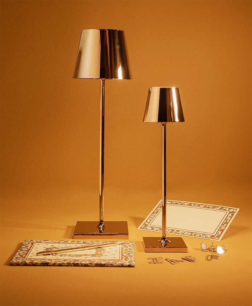 Ta przenośna lampka stołowa Poldina ma stylowy design z klasycznym kloszem na smukłej nodze z dyskretną podstawą. Lampa dostępna jest również w mniejszych wersjach mini i micro.