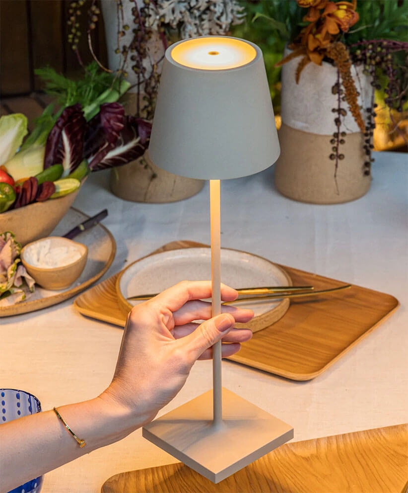 Seria lamp Poldina obejmuje między innymi lampki stołowe, lampy podłogowe i lampy wiszące z ładowalnym akumulatorem.
