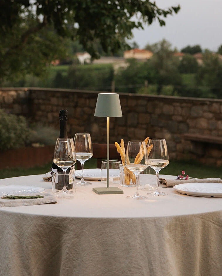 Zaleca się łączenie tej lampy stołowej Poldina w kolorze sage green z innymi lampami z serii Poldina, które obejmują lampy stołowe w różnych rozmiarach oraz lampy podłogowe i zwisy z ładowalnym akumulatorem.