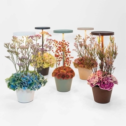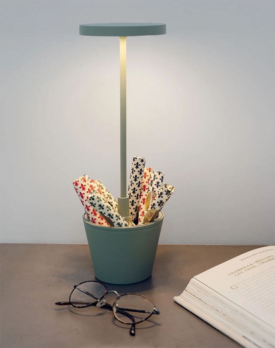 Ta przenośna lampka stołowa Poldina Reverso ma nietypowy design, gdzie klasyczna lampka stołowa jest odwrócona do góry nogami. Wykorzystano to, aby wyposażyć lampę bateryjną w wielofunkcyjny i bezpieczny dla żywności pojemnik z termoplastu (PET), który można używać jako wazon na kwiaty lub miseczkę na słodycze.