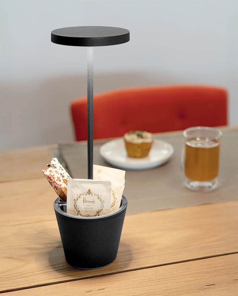Ta przenośna lampka stołowa Poldina Reverso ma nietypowy design, w którym klasyczna lampka stołowa jest odwrócona do góry nogami. Wykorzystano to, aby wyposażyć lampę bateryjną w wielofunkcyjny i bezpieczny dla żywności pojemnik z termoplastu (PET), który można używać jako wazon na kwiaty lub miseczkę na słodycze.