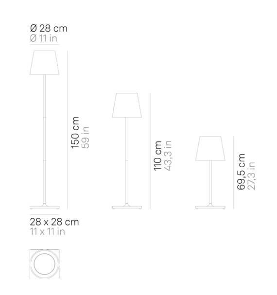 Lampa podłogowa jest łatwa do przenoszenia i można ją dostosować do wysokości 150 cm, 110 cm lub 69,5 cm, usuwając lub dodając części trzonka.