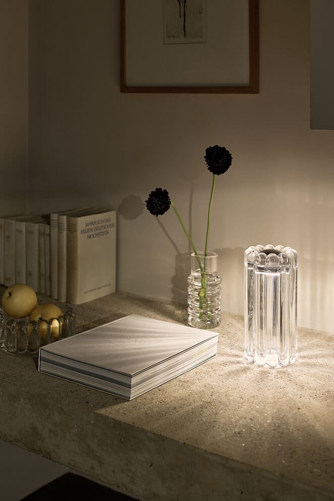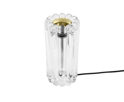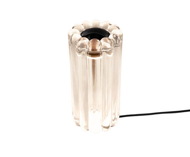 Lampa stołowa Press jest wykonana z grubego prasowanego szkła i zaprojektowana, aby przetrwać wieczność. Żebrowane szkło łamie i rozprasza światło w liniowe i paskowane wzory, czyniąc lampę stołową małą rzeźbą świetlną. Metalowy klosz lampy Press lampy stołowej można wymieniać, a w zestawie znajdują się klosze w kolorze srebrnym, złotym i czarnym.