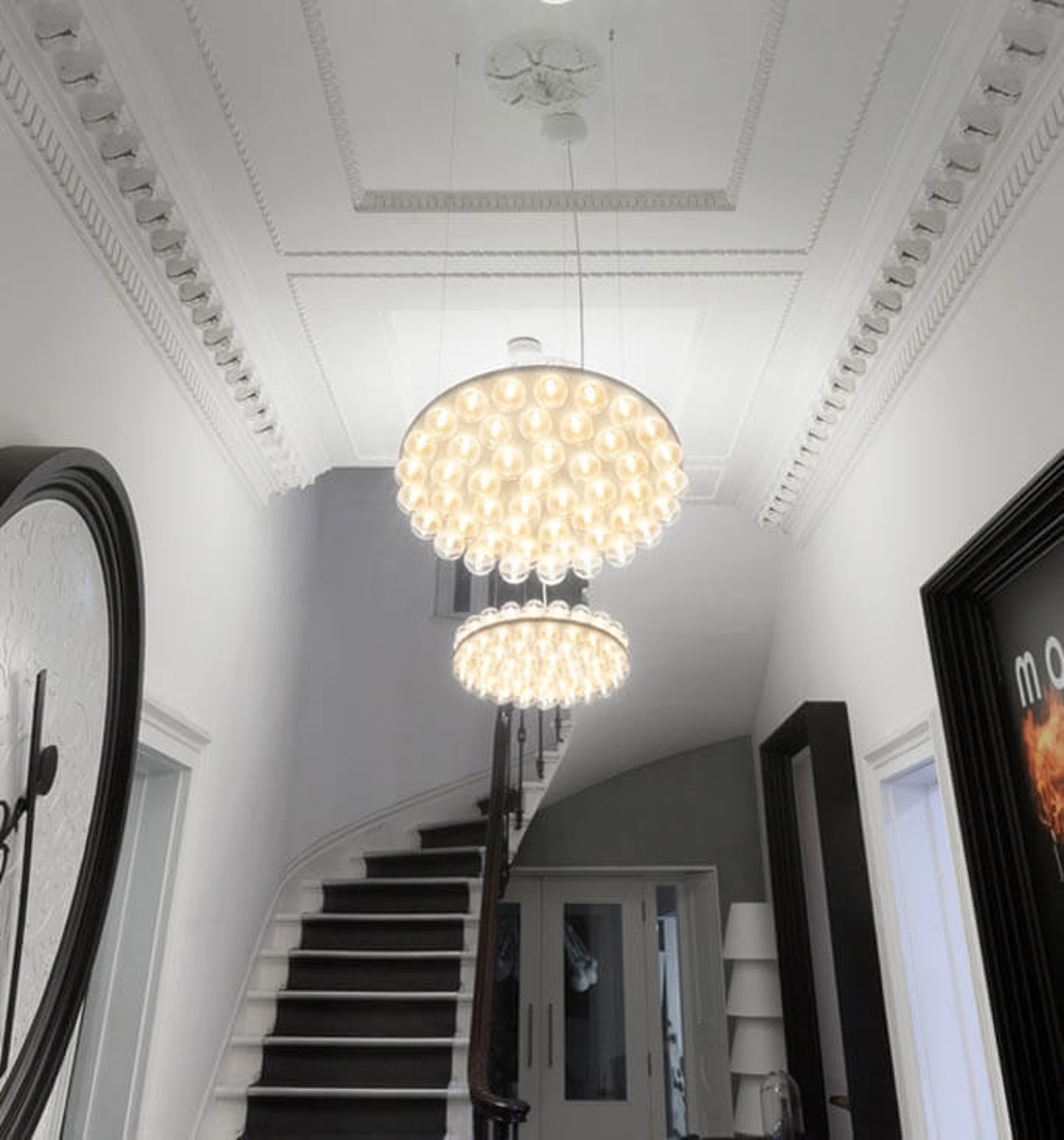 Seria Prop Light od Moooi składa się z kolekcji luksusowych lamp wiszących i lamp podłogowych, które łączy to samo ponadczasowe i eleganckie wzornictwo, ale różnią się formą i funkcją. W wyjątkowej Prop Light Round Double lampie wiszącej na pierwszym planie jest spektakularne światło, ponieważ 18 źródeł LED zostało zintegrowanych z centralnym projektem.