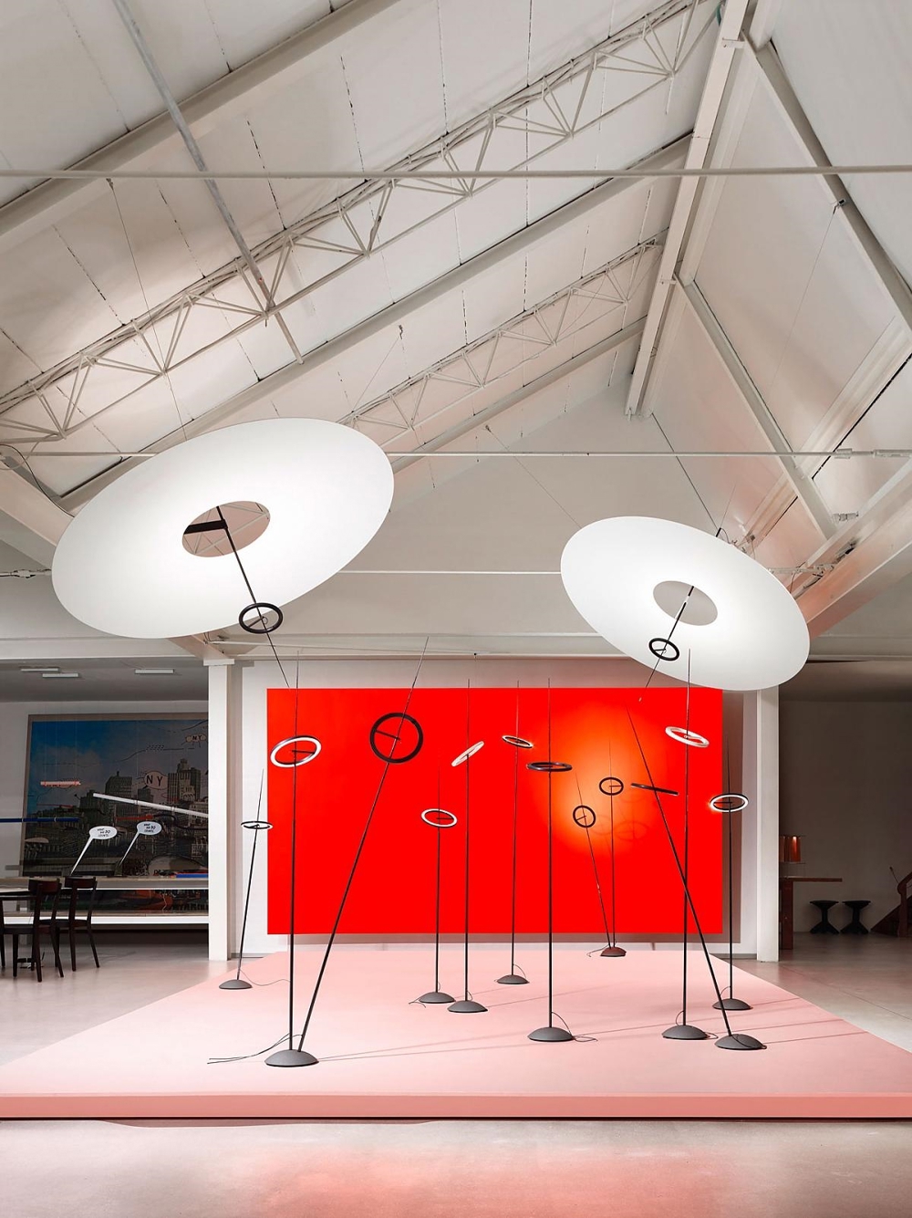 Ingo Maurer Ringelpiez lampa podłogowa z aluminiowym pierścieniem z wbudowanymi ściemnialnymi diodami LED, które można zamontować jako światło skierowane w górę lub w dół. Bez użycia narzędzi można regulować kąt pierścienia, pręta, a nawet zmieniać kierunek diod LED. Pręt z włókna węglowego można zamocować pionowo lub pod kątem 15° u podstawy. Nie ma żadnych wizualnych zakłóceń wokół smukłego, ostrego pręta, kabel jest ukryty. Mimo to pręt można wydłużyć z 150 do 210 cm. Transformator z regulatorem suwakowym oraz dodatkowo ściemniacz.