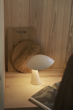 Lampa bateryjna Rumee w kolorze białym ma nowoczesny i funkcjonalny design z miękką, rzeźbiarską formą inspirowaną falistymi krzywiznami przestronnej i szerokiej czapki. Nazwa nawiązuje do dźwięku słowa roomie - nieformalnego określenia współlokatora - i wywołuje poczucie domowości, ciepła i bezpieczeństwa.