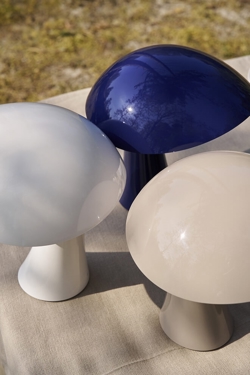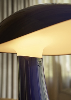Lampa bateryjna Rumee w kolorze niebieskim ma nowoczesny i funkcjonalny design z miękką rzeźbiarską formą inspirowaną falistymi krzywiznami przestronnej i szerokiej kapelusza. Nazwa nawiązuje do dźwięku słowa roomie - nieformalnego określenia współlokatora - i wywołuje poczucie domowości, ciepła i bezpieczeństwa.