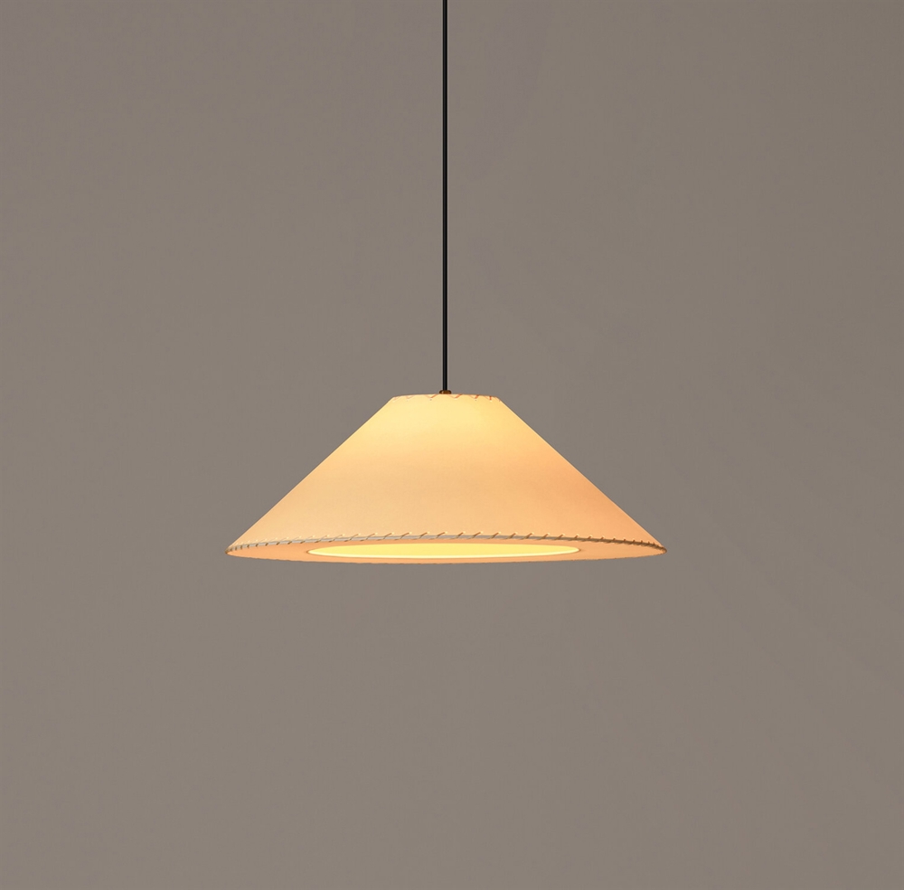 Santa & Cole Sísísí Cónicas Planas lampa wisząca, stitched beige parchment z kablem/baldachimem w kolorze czarnym/satynowym niklu - zaprojektowana przez Gabriela Ordeig Colei w 1987 roku.