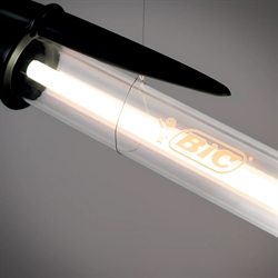 BIC® Lamp na nowo interpretuje legendarny BIC® Cristal w skali 12:1 w trzech najbardziej rozpoznawalnych wersjach – klasycznej czarnej, niebieskiej i czerwonej – jako połączenie lampy podłogowej, lampy wiszącej i lampy ściennej. Wykonana z materiałów, które wiernie odwzorowują oryginał, a jednocześnie zapewniają optymalne oświetlenie, lampa oddaje hołd jednemu z najbardziej rozpowszechnionych i uwielbianych przedmiotów na świecie.
