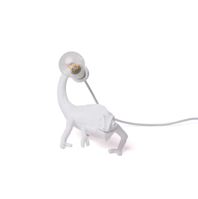 Swobodny i towarzyski biały kameleon to idealna dekoracja do wnętrz, które nie boją się ciekawskich spojrzeń. Ta lampa została wykonana z żywicy i jest przeznaczona do użytku wewnątrz.
