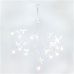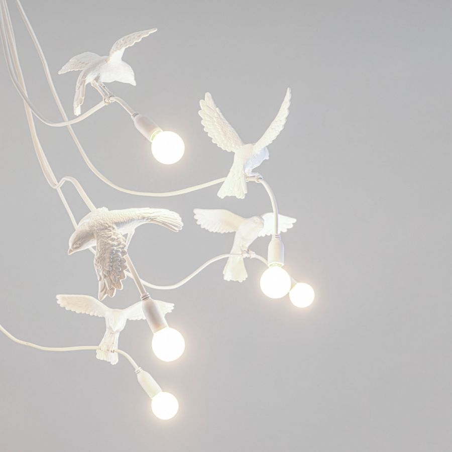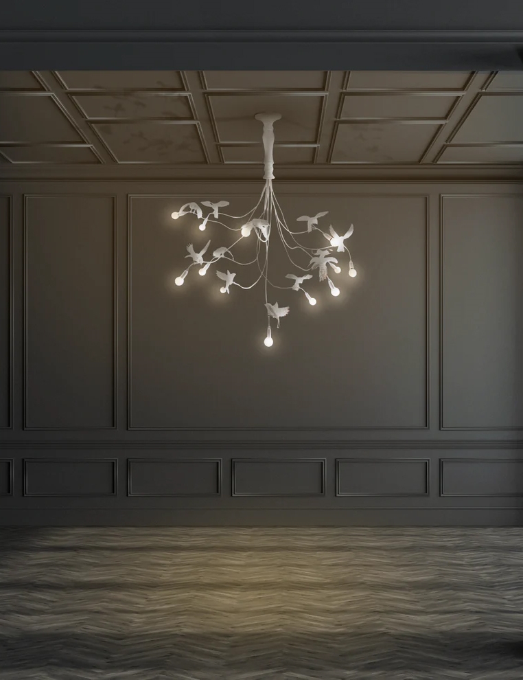 Czujemy żywiołowość ptaków, gdy niemal budzą światło do życia. Projektant chciał uchwycić ten wyjątkowy moment, kiedy obserwuje się małego ptaszka, skrycie pochłoniętego własnym światem. Charakterystyczny przewód lampy podkreśla ruch i odtwarza subtelny, niemal magiczny nastrój, który wyróżnia te małe istoty. Poetycki i nastrojowy design, który wnosi do wnętrza ciepło, lekkość i osobowość.