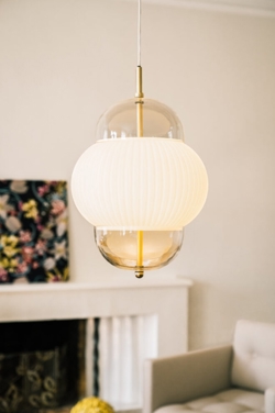 Shahin to niezwykle elegancki pendel z pięknymi detalami z mosiądzu, składający się z dwóch szklanych kloszy i pięknego białego opalowego szkła w środku.