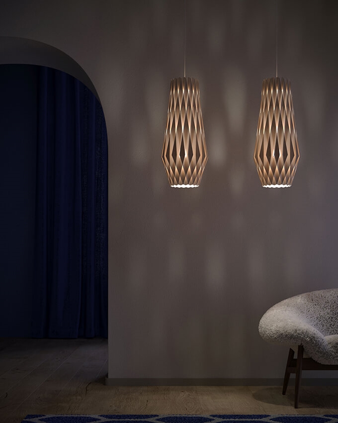 Lampa wisząca dzięki swojemu dużemu kształtowi wypełnia przestrzeń i pasuje zarówno do prywatnych, jak i publicznych wnętrz. Wykonana jest z certyfikowanej, zrównoważonej sklejki brzozowej, ręcznie robionej. Listwy brzozowe tworzą ciepło, gdy światło przez nie prześwieca, a całość jest złożona bez użycia śrub czy kleju. Dodatkowo, lampa ma stylowy i geometryczny design, który przyciąga wzrok w każdym pomieszczeniu.