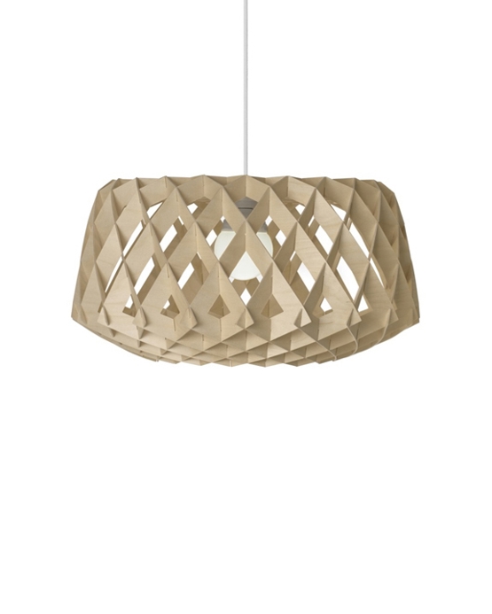 Lampa wisząca dzięki swojemu dużemu kształtowi wypełnia przestrzeń i pasuje zarówno do prywatnych, jak i publicznych wnętrz. Składa się z naturalnego i zrównoważonego drewna, ręcznie wykonanego w Finlandii. Drewno tworzy ciepło, gdy światło przez nie prześwieca, i jest złożone bez użycia śrub czy kleju. Dodatkowo lampa ma stylowy i geometryczny design, który przyciąga wzrok w każdym pomieszczeniu