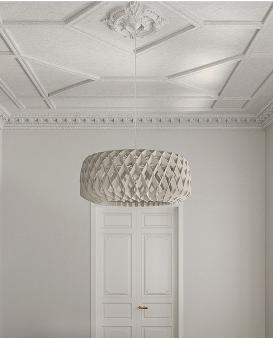 Lampa wisząca dzięki swojemu dużemu kształtowi wypełnia przestrzeń i pasuje zarówno do prywatnych, jak i publicznych wnętrz. Składa się z naturalnego i zrównoważonego drewna, które jest ręcznie wykonane. Drewno tworzy ciepło, gdy światło przez nie przechodzi, i jest złożone bez użycia śrub czy kleju. Ponadto lampa ma stylowy i geometryczny design, który przyciąga wzrok w każdym pomieszczeniu.