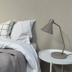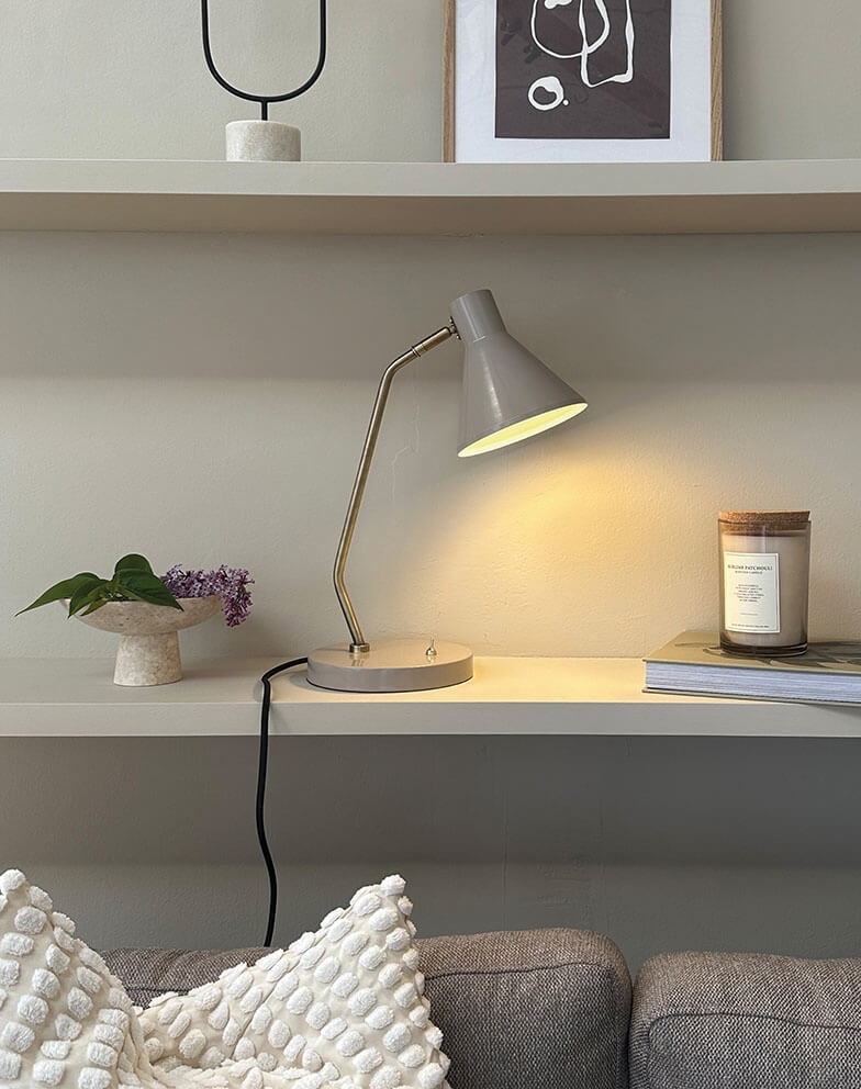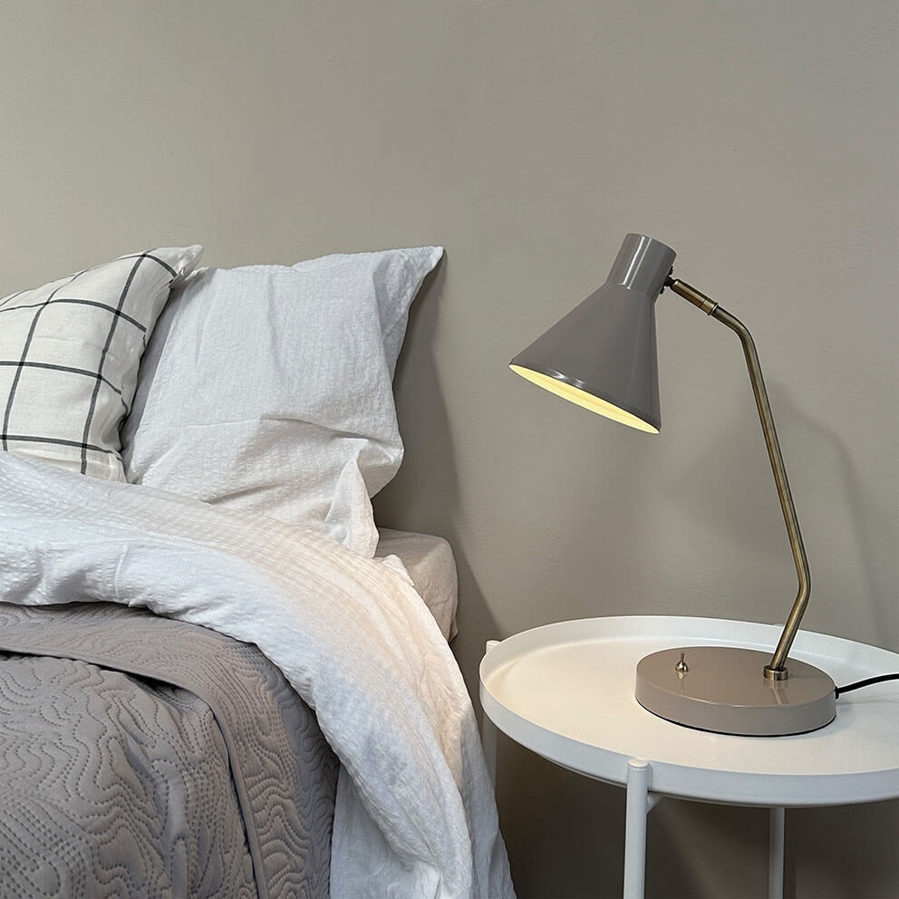 Sleep lampa stołowa ma minimalistyczny design i jest idealna jako lampa na stolik nocny w sypialni, biurko w biurze lub regał w salonie. Lampa stołowa emanuje prostą elegancją z zagięciem na mosiężnym pręcie i kloszem, który można przechylać. Lampa jest włączana i wyłączana za pomocą przełącznika na podstawie.