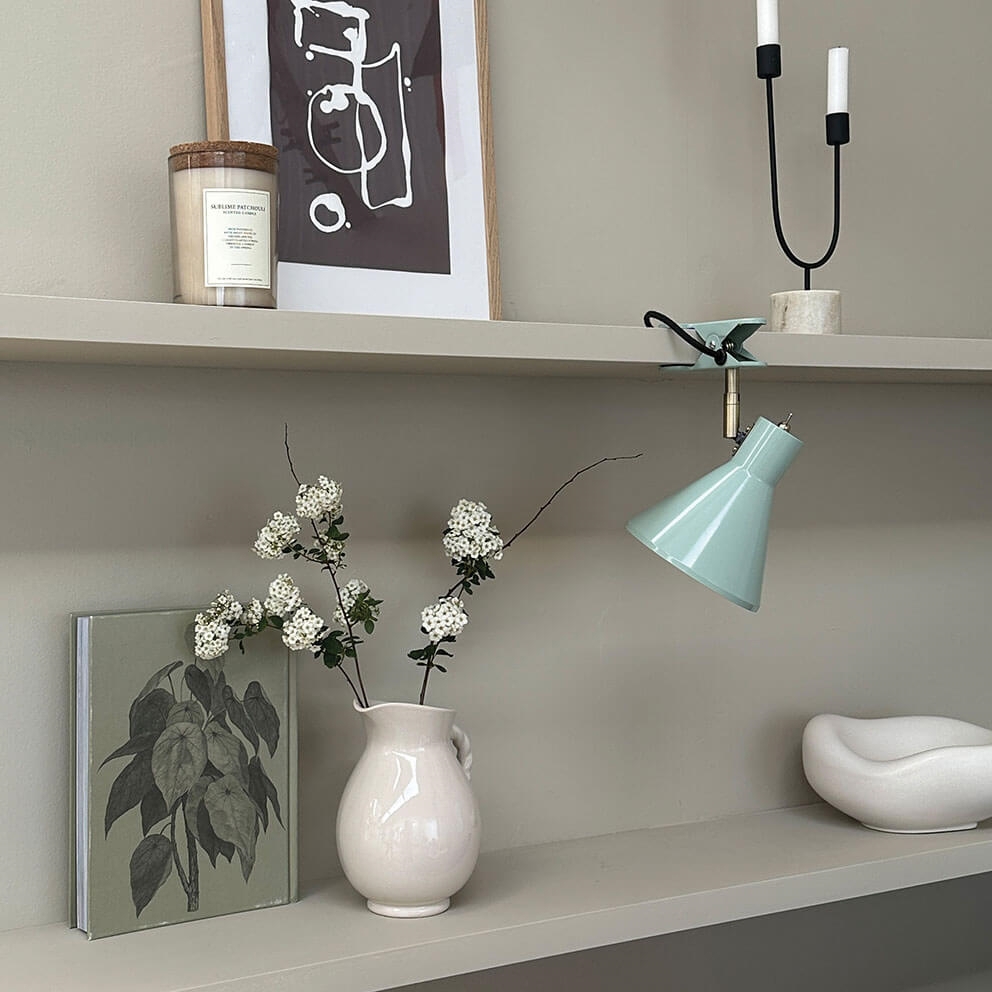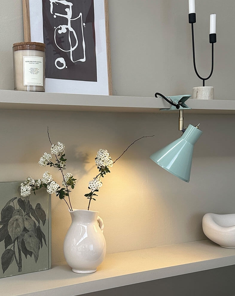 Sleep lampa z klipsem dostępna jest w kolorach kości słoniowej, miętowym i brązowym. Seria obejmuje również lampę ścienną, lampę stołową i lampę podłogową w tych samych kolorach.