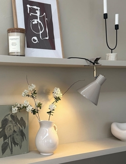Sleep lampa z klipsem zapewnia elastyczne oświetlenie do sypialni, salonu lub innego pomieszczenia wymagającego światła do czytania lub pracy. Włącznik do zapalania i gaszenia lampy znajduje się na kloszu, który można przechylać i obracać, aby samodzielnie ustalić kierunek światła. Dzięki prostym liniom i materiałom wysokiej jakości lampa wprowadza nowy element do Twojego wnętrza.