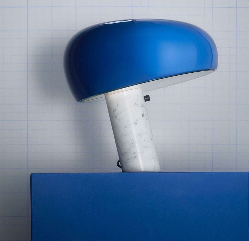 Flos Snoopy lampa stołowa zaprojektowana przez Achille & Pier Giacomo Castiglioni dla Flos w pięknym navy blå.