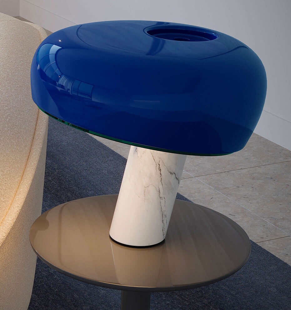 Emaliowany metalowy klosz lampy elegancko spoczywa na solidnej podstawie z polerowanego marmuru, co nadaje jej ekskluzywny i wyrafinowany wygląd. Połączenie formy, materiału i proporcji sprawia, że Snoopy jest przyciągającym wzrok obiektem designerskim, który pasuje zarówno do nowoczesnych, jak i klasycznych wnętrz.