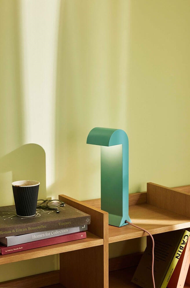Lampa stołowa Soothe w turkusie ma komiksowy i rzeźbiarski design z artystycznym i graficznym wyrazem. Lampa jest ściemnialna, więc jasność można dostosować do pożądanej atmosfery, co czyni ją idealnym dodatkiem do przytulnego kącika w domu.