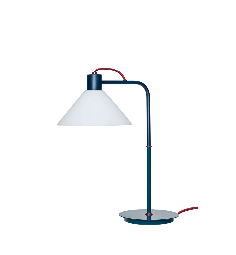 Lampa stołowa Spot łączy klasyczną funkcjonalność z nowoczesnym wyglądem i dzięki eleganckiemu designowi wzbogaci każde wnętrze. Lampa ma harmonijny i żywy wygląd z niebieską podstawą, białym kloszem i czerwonym przewodem. Projekt dodaje ciepła i atmosfery do pomieszczenia, niezależnie od tego, czy lampa jest umieszczona na biurku, półce czy regale.