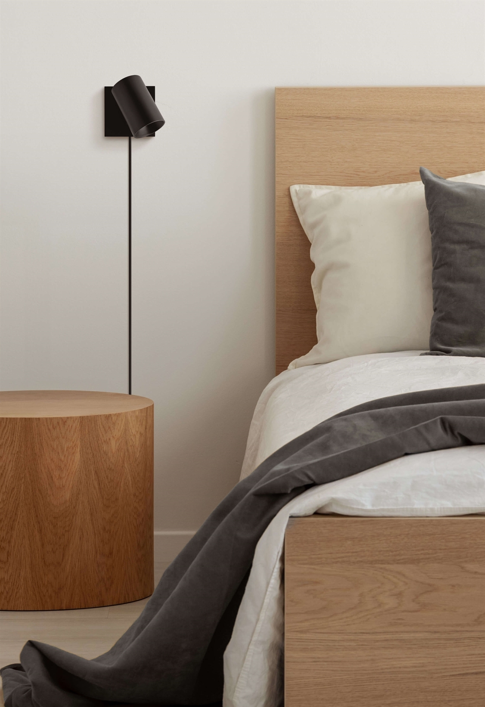 SpotOn1 Wall dostępny jest w kolorze białym i czarnym oraz w wersji z okrągłą podstawą. Lampa jest przeznaczona do montażu bezpośrednio na ścianie i wyposażona w otwór na kabel, co ułatwia podłączenie przewodu.