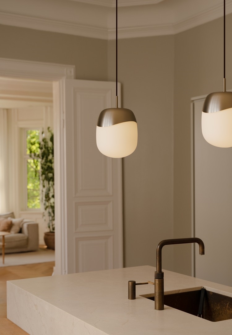 Lampa wisząca Spring tworzy spokojną atmosferę i ma rzeźbiarski charakter. Lampa łączy miękkie formy z wyrazistymi materiałami i została opracowana tak, aby zapewniać przyjemne, nastrojowe światło w domu. Projekt równoważy prostotę i charakter dzięki kontrastowi między kloszem z opalowego szkła a eleganckim zawieszeniem i detalami z mosiądzu. Efektem jest wyrafinowana, rzeźbiarska lampa wisząca o niemal unoszącym się wyglądzie, która stanie się naturalnym punktem przyciągającym wzrok we wnętrzu.