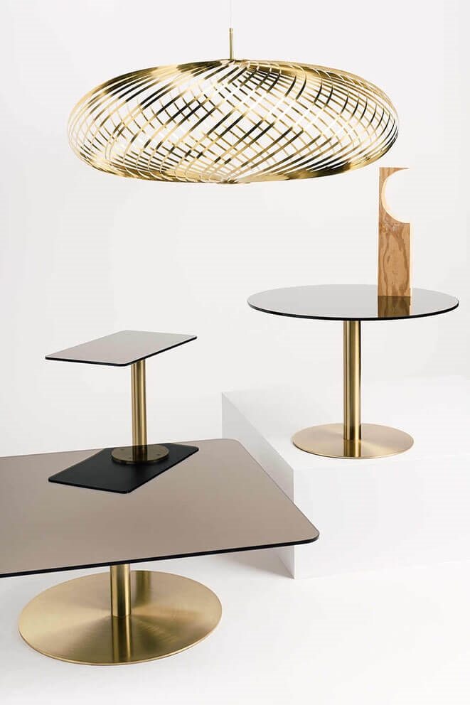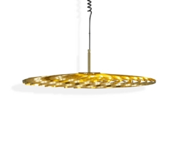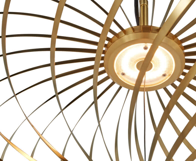 Spring pendel składa się z kilku elastycznych taśm ze stali nierdzewnej z wykończeniem mosiężnym, które można regulować jak sprężynę, tworząc różne sylwetki od całkowicie płaskiej formy do pełnej formy dyni. Pendel oferuje piękną grę światła i cienia i doskonale wpasuje się w wiele aranżacji wnętrz. Można go na przykład umieścić nad stołem jadalnym.