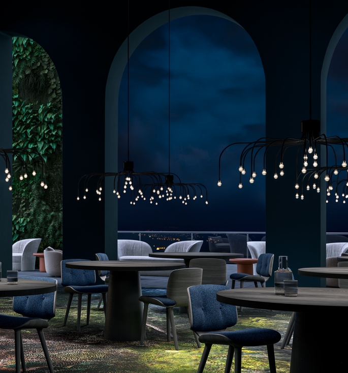 Zawieś imponującą lampę wiszącą Starfall Light nad stołem jadalnianym – albo wysoko w pomieszczeniu, aby uzyskać spektakularny efekt.