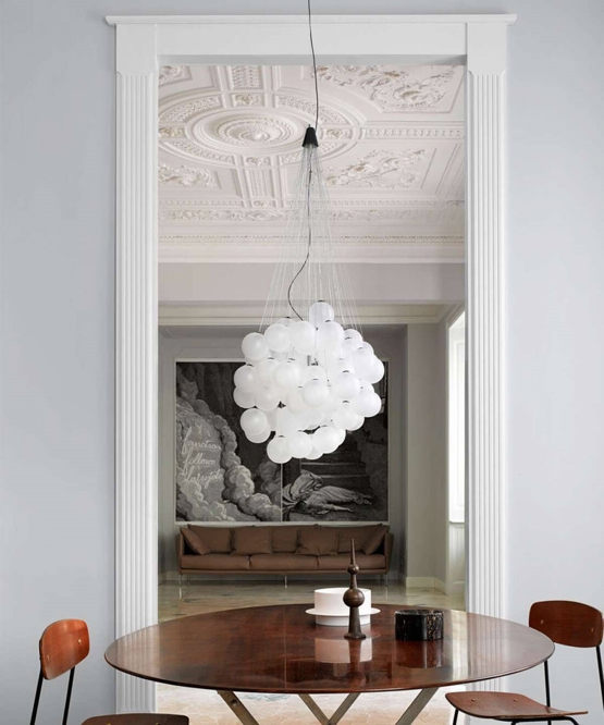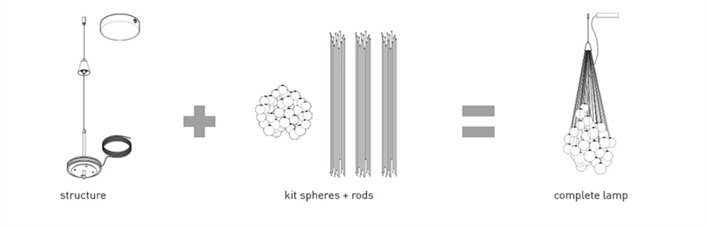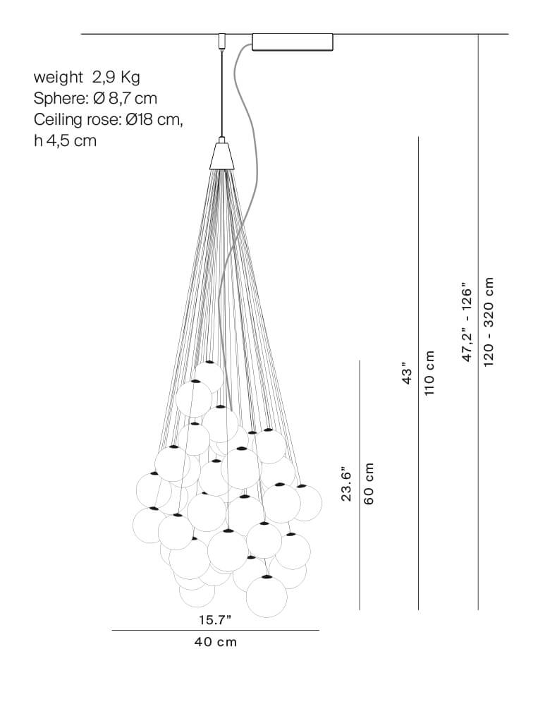 Stochastic to niezwykła i estetyczna lampa wisząca lub żyrandol stworzona z energooszczędnym źródłem światła LED dyskretnie umieszczonym w środku lampy i ukrytym przez piękne, świecące kule, które tworzą nastrojowe, poetyckie oświetlenie. Dzięki kompozycji szklanych kul na różnych wysokościach, Stochastic przyjmuje nieskończone kombinacje w rodzaju kontrolowanej wolności: każda kula jest połączona z małymi stalowymi prętami o różnej długości, które można przymocować do struktury według uznania. Światło pochodzi z jednego z kul zamkniętego modułu LED, który generuje ciepłe, pośrednie światło skierowane zarówno w górę, jak i w dół.