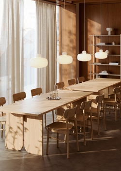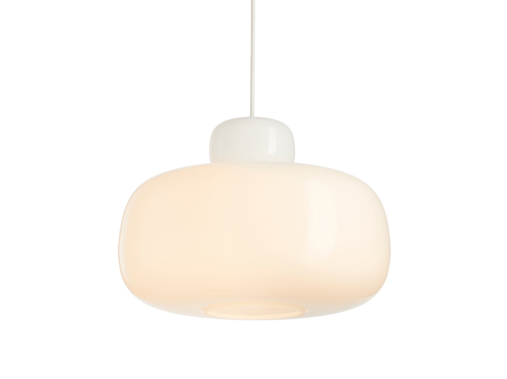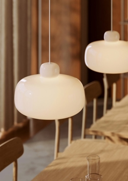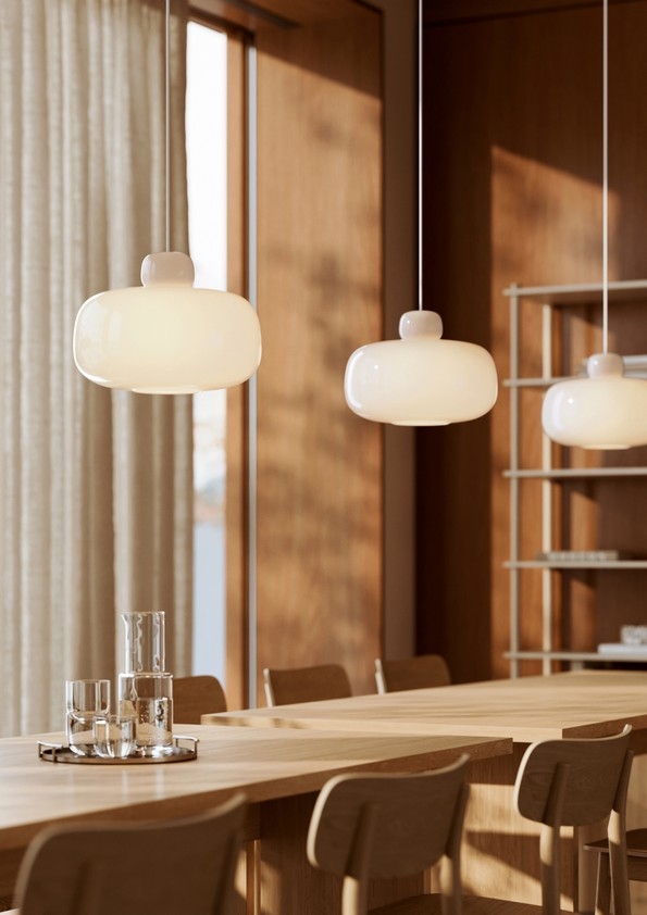 Ta mlecznobiała lampa wisząca Stone ze szkła opalowego triplex została wprowadzona w 2026 roku i ma elegancką, wydłużoną sylwetkę, będąc nowym dodatkiem do serii Stone. Wprowadzono również małą lampę wiszącą ze szkła opalowego triplex o dobrze znanej formie Stone. Obie są dostarczane