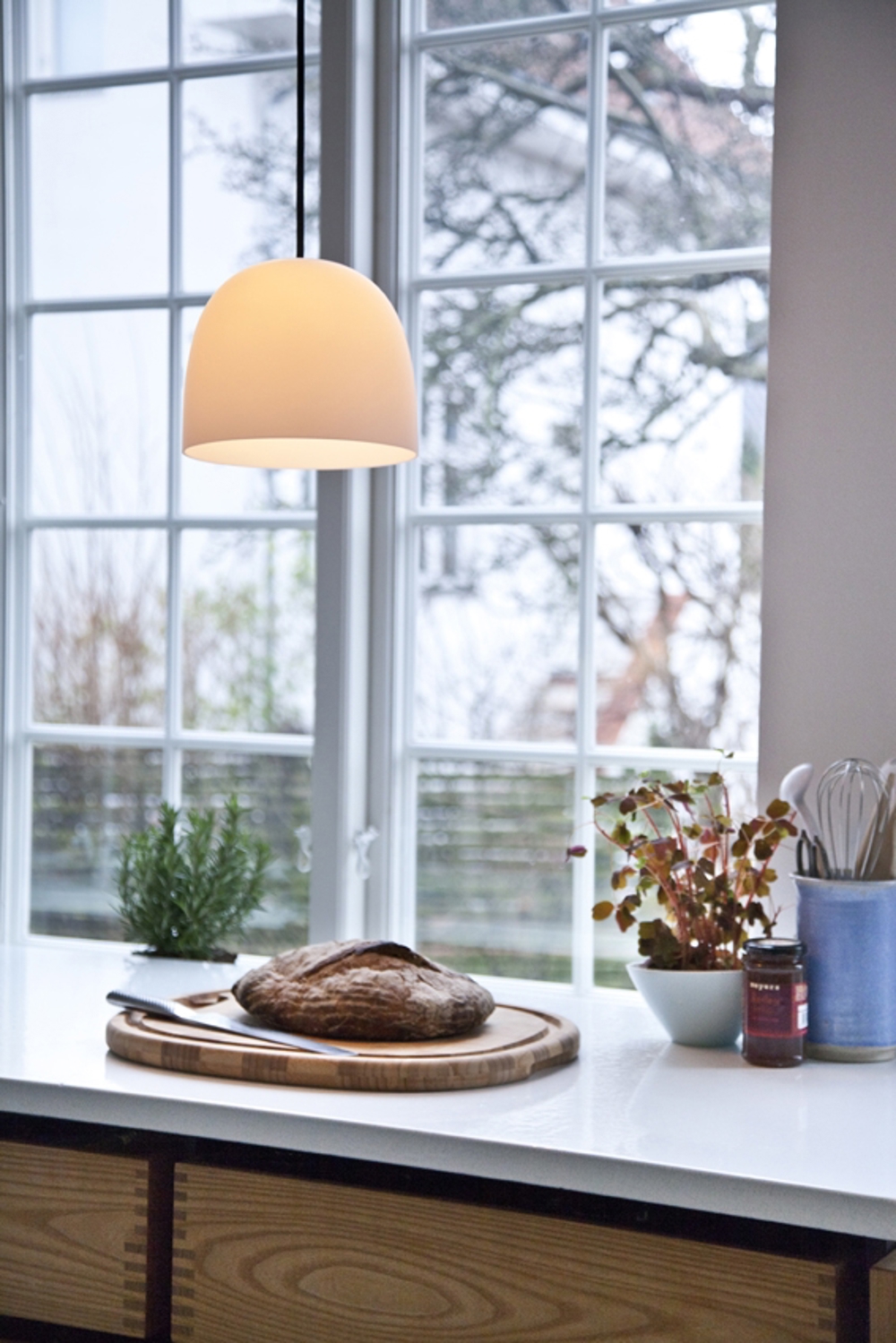 Super pendel dostępny jest w trzech różnych rozmiarach w opalu (największy można również wybrać z białym lakierowaniem) z białym, czarnym lub czerwonym kolorem przewodu.