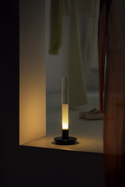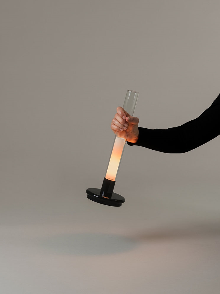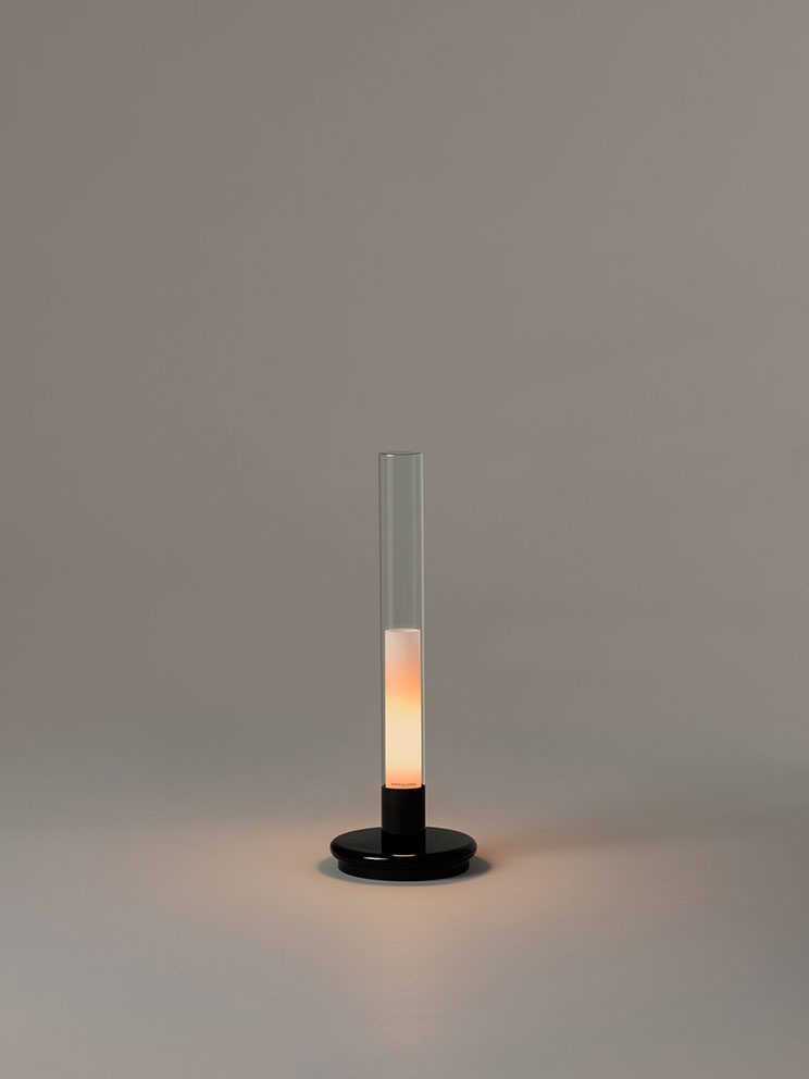 Klosz wykonany jest z przezroczystego szkła Pyrex, a metalowa podstawa jest w czarnym połysku. Wyłącznik znajduje się na lampie, która ma 2 poziomy jasności. Przy najwyższej mocy świeci przez 7 godzin, a przy najniższej przez 14 godzin. Pełne naładowanie trwa 5 godzin.