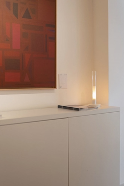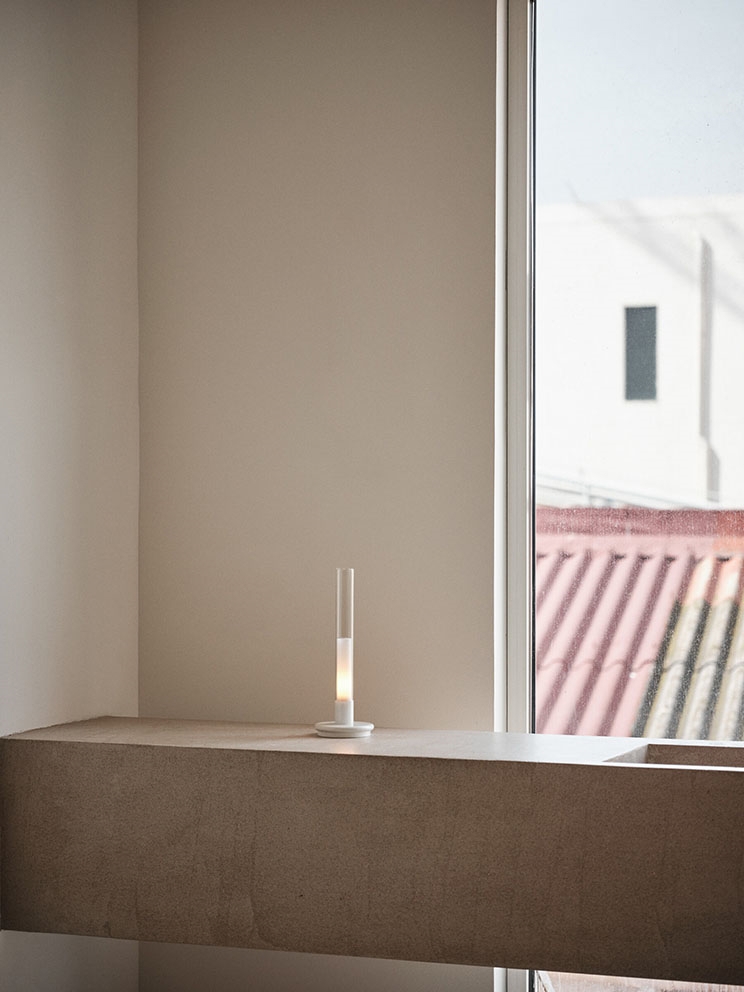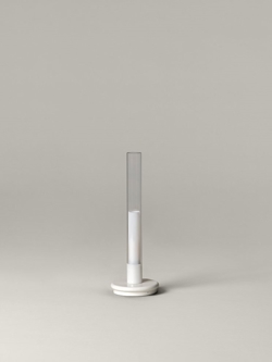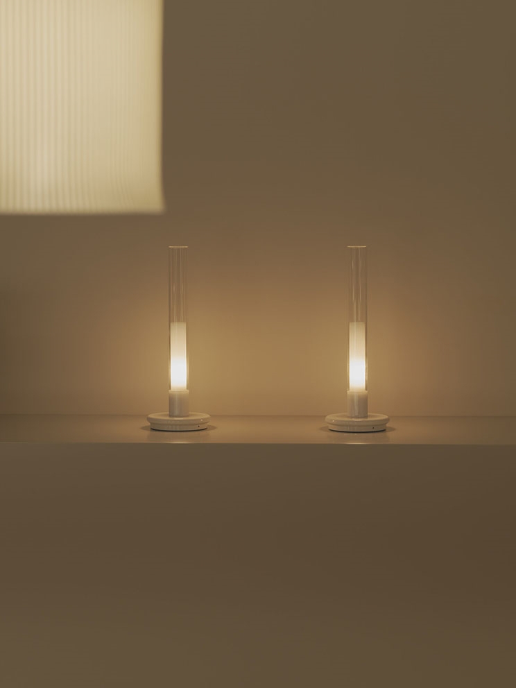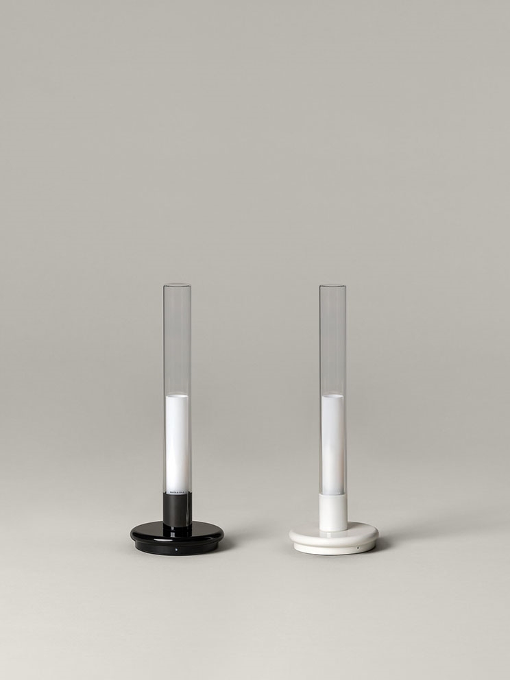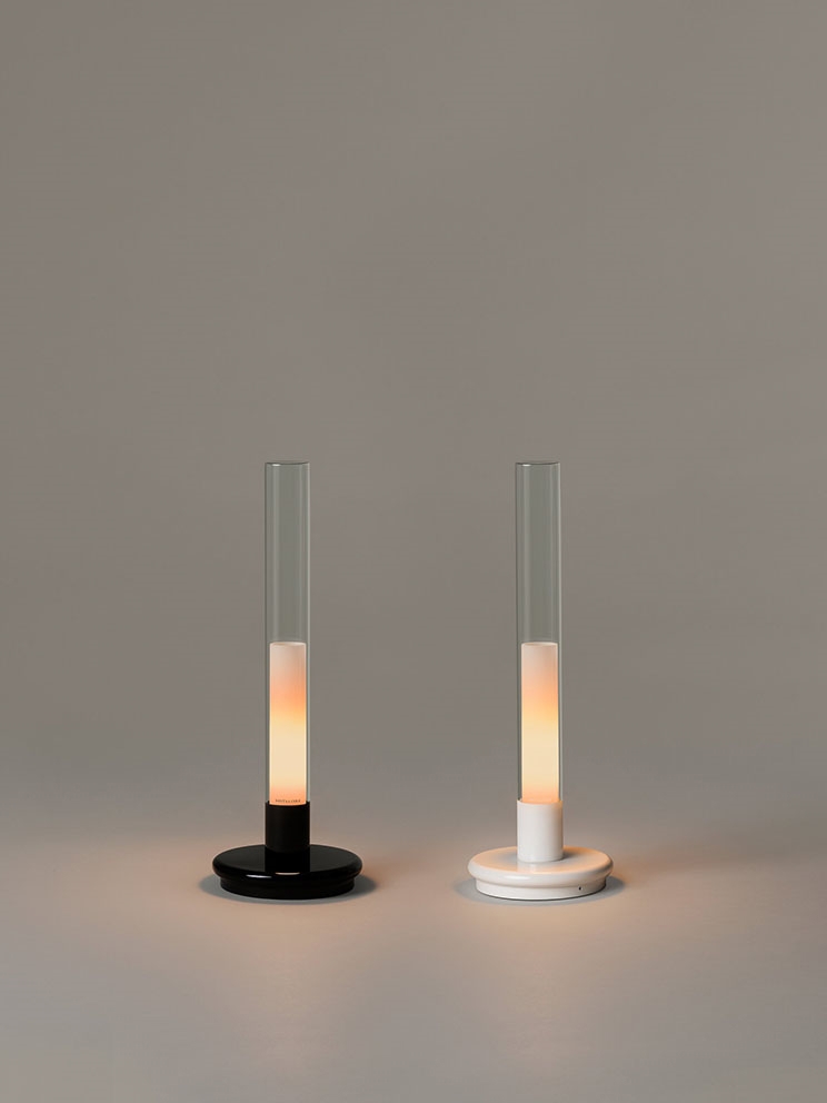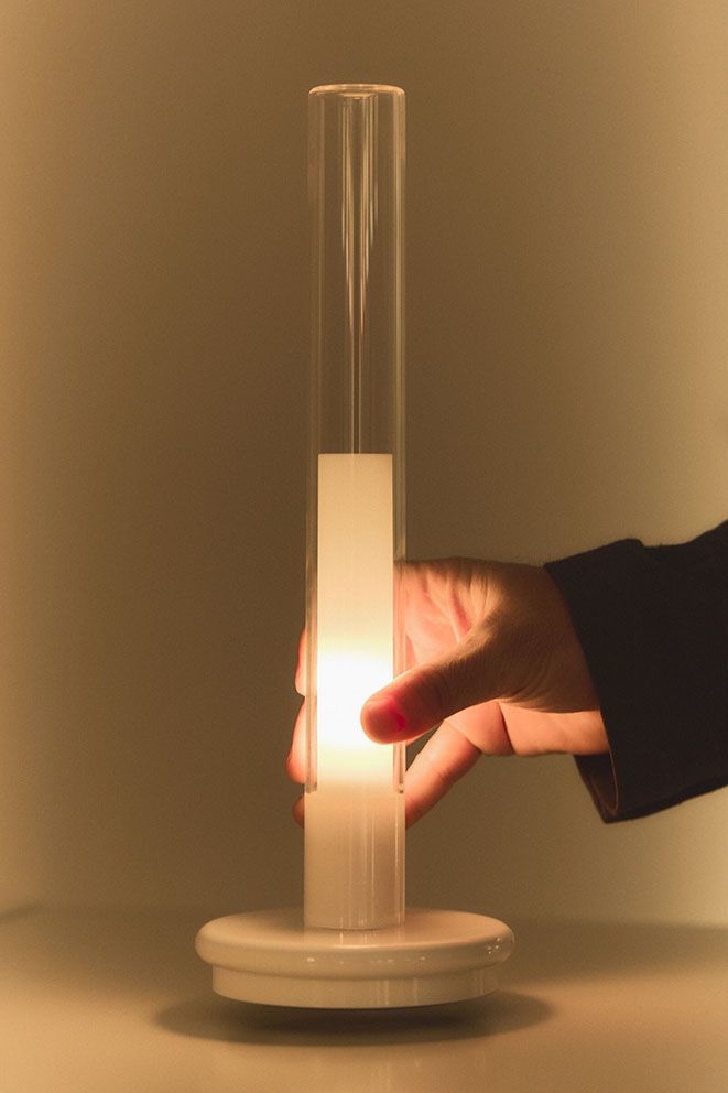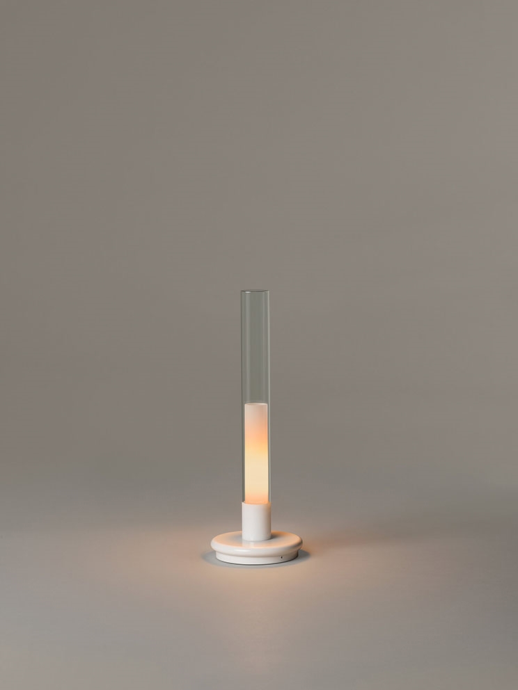 Klosz wykonany jest z przezroczystego szkła Pyrex, a metalowa podstawa jest błyszcząca biała. Wyłącznik znajduje się na lampie, która ma 2 poziomy jasności. Przy najwyższej mocy świeci przez 7 godzin, a przy najniższej przez 14 godzin. Pełne naładowanie trwa 5 godzin.