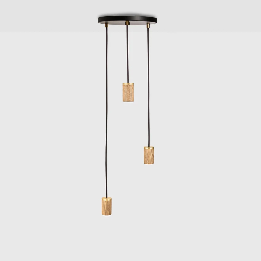 Tala Triple pendel dostępny jest z białym lub czarnym baldachimem sufitowym, z uchwytami w kolorze czarnym, mosiężnym, grafitowym i dębowym.