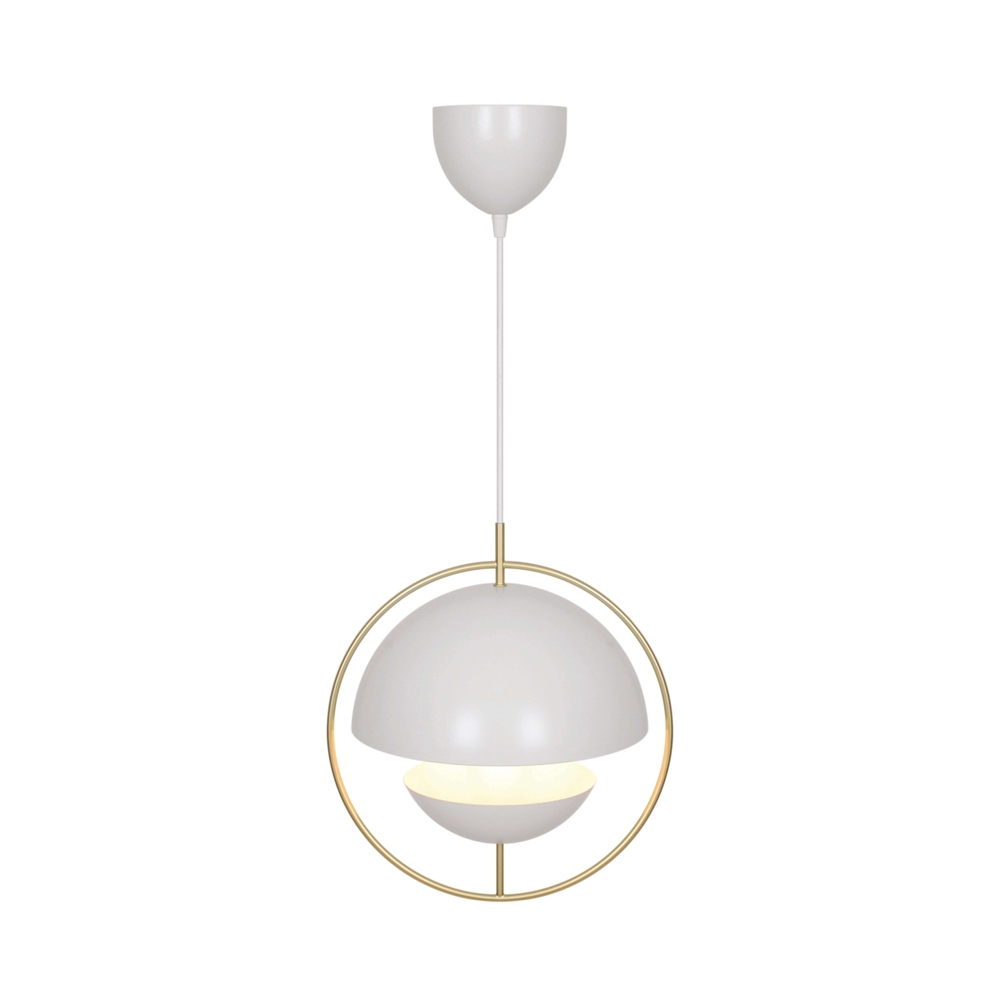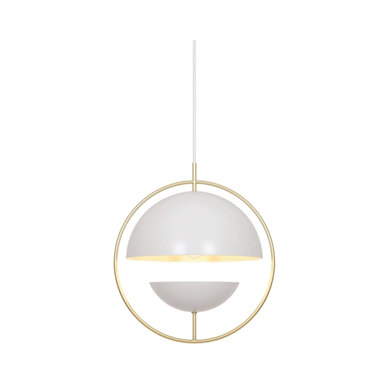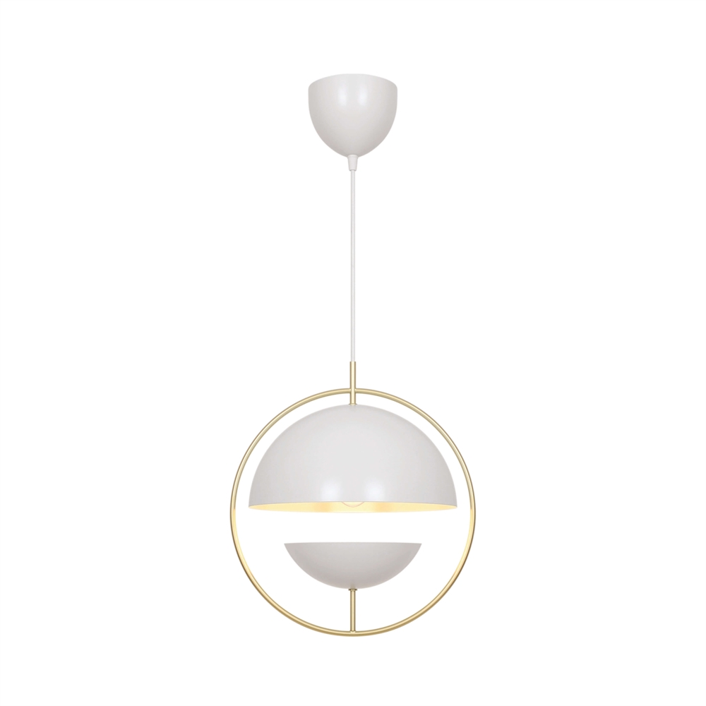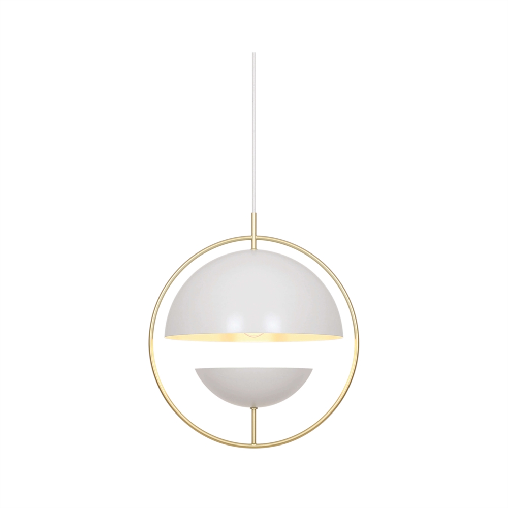 Tavia to dekoracyjna lampa wisząca o minimalistycznym designie i glamour wyrazie. Dwie półokrągłe matowe klosze w kolorze białym są otoczone eleganckim pierścieniem z błyszczącego mosiądzu, co zapewnia przyjemne światło.