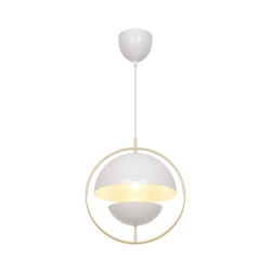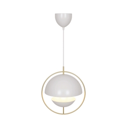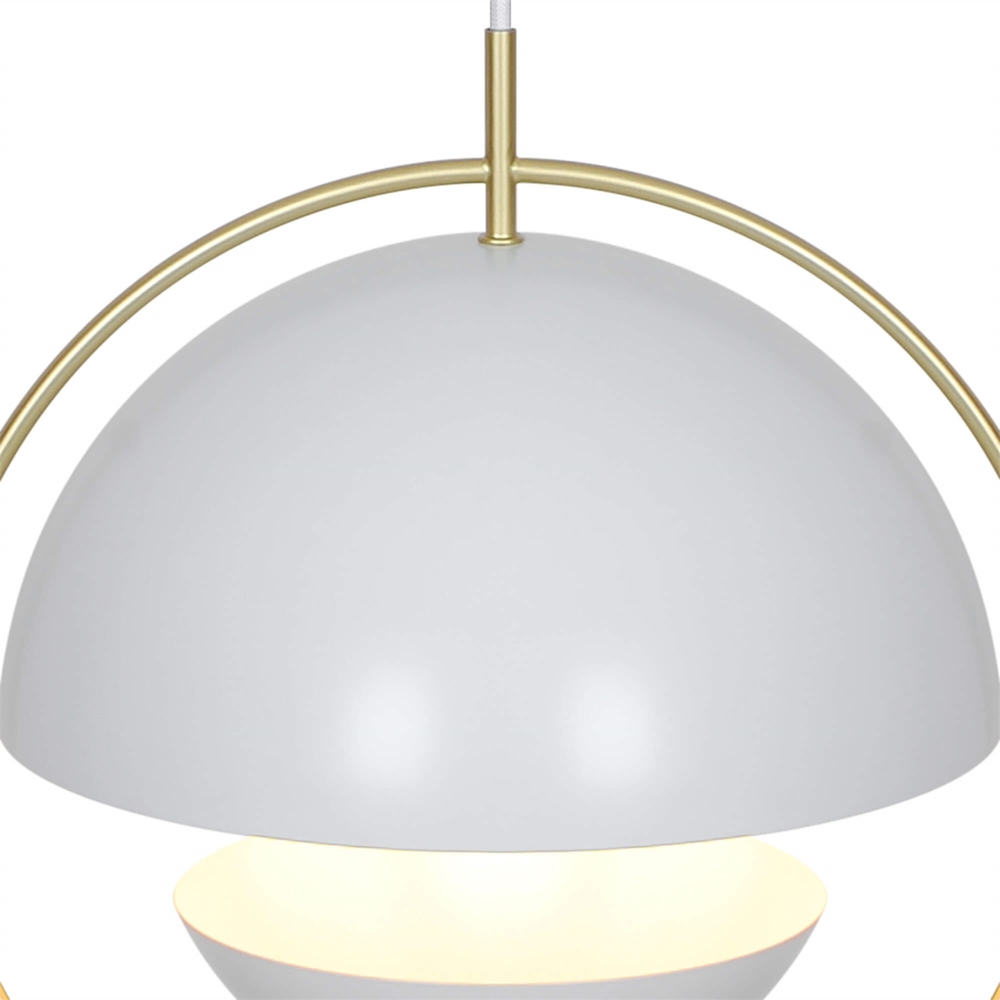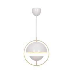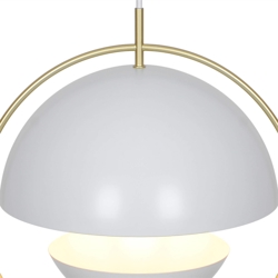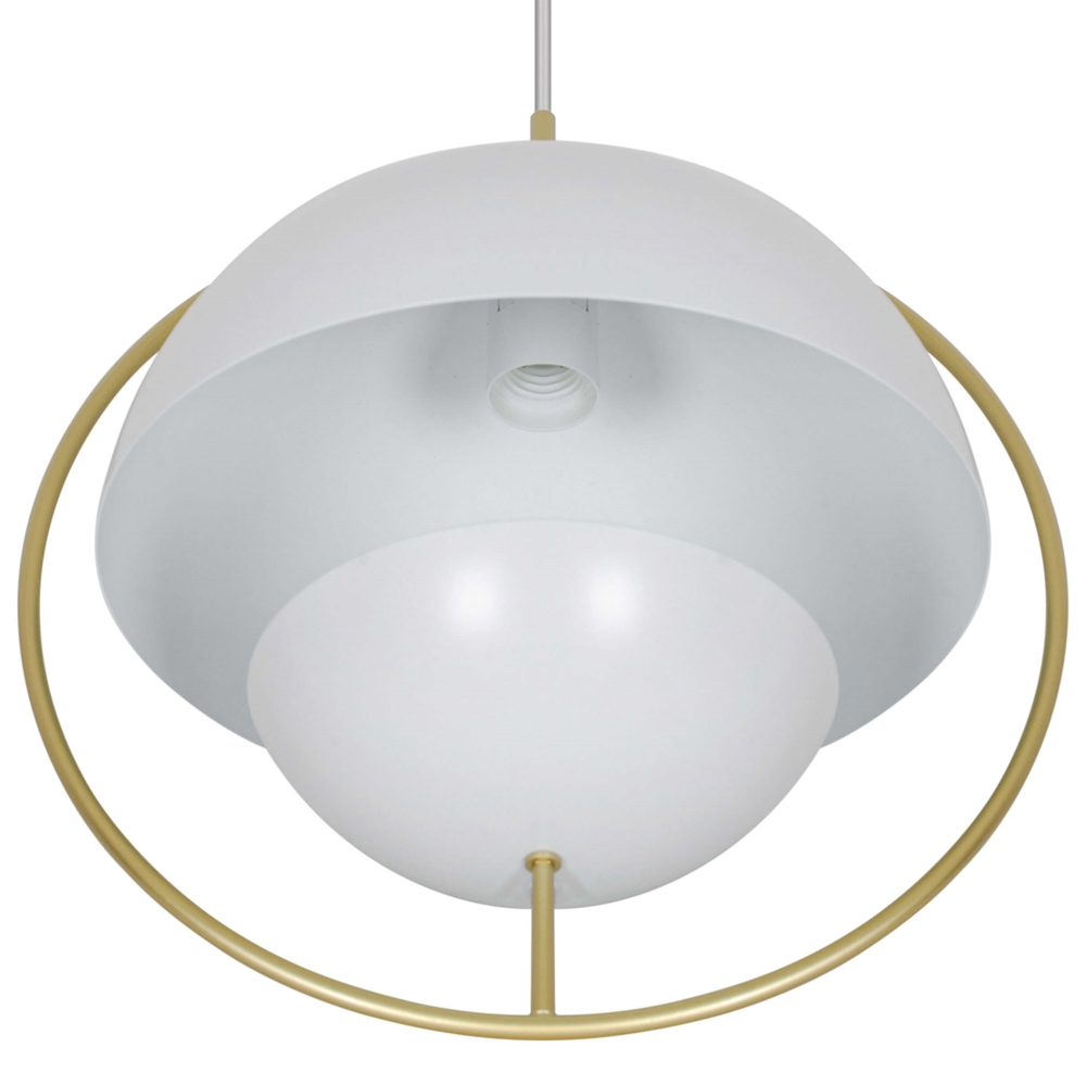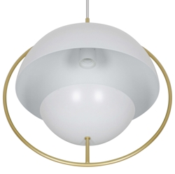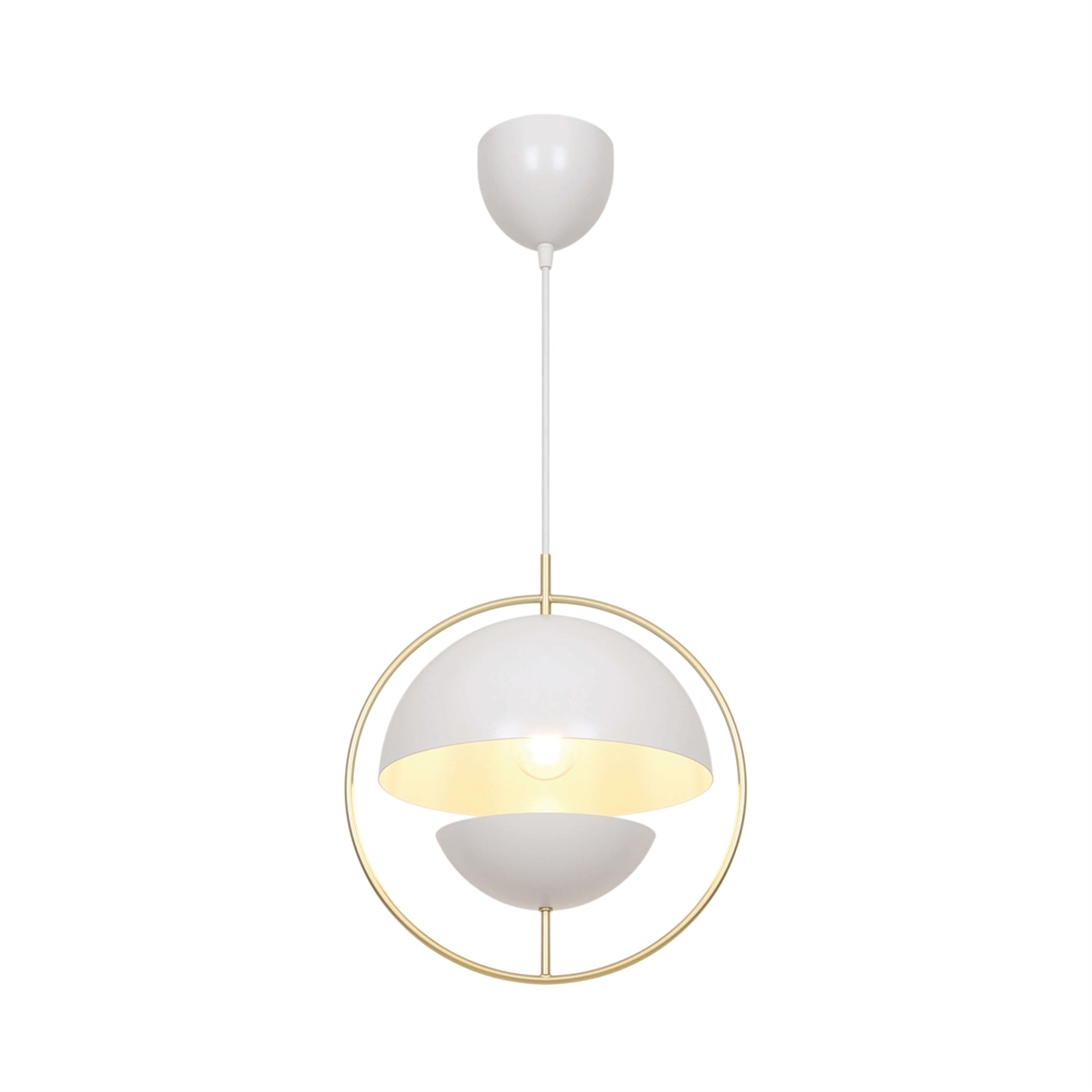 Tavia to dekoracyjna lampa wisząca o minimalistycznym designie i glamour wyrazie. Dwie półokrągłe matowe klosze w kolorze białym są otoczone eleganckim pierścieniem z błyszczącego mosiądzu, co zapewnia przyjemne światło.