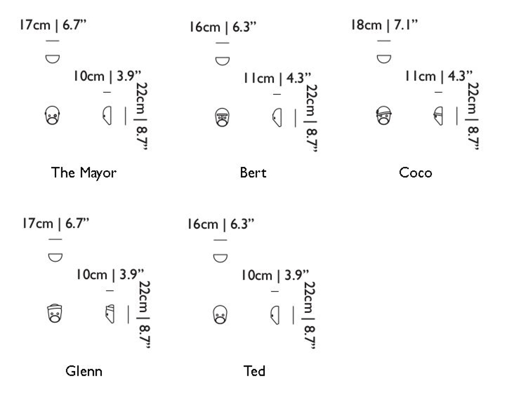 'Lampy ścienne The Party są inspirowane grupą silnych, fascynujących osobowości, gdzie ich odlewane ceramiczne twarze skupiają się na naszej fascynacji tajemnicami, dynamiką rodzinną i intrygami. Jeśli są widziane razem - jako grupa na przyjęciu - rozświetlają scenę z chłodnym nastawieniem, ale za złożonymi fasadami lamp kryje się również figlarna strona, która pobudza naszą wyobraźnię. Osobowości te mają każda swoją fascynującą historię, która je łączy. Fragmenty ich osobowości odzwierciedlają ukryte strony człowieka, wzbudzając zainteresowanie i ciekawość.