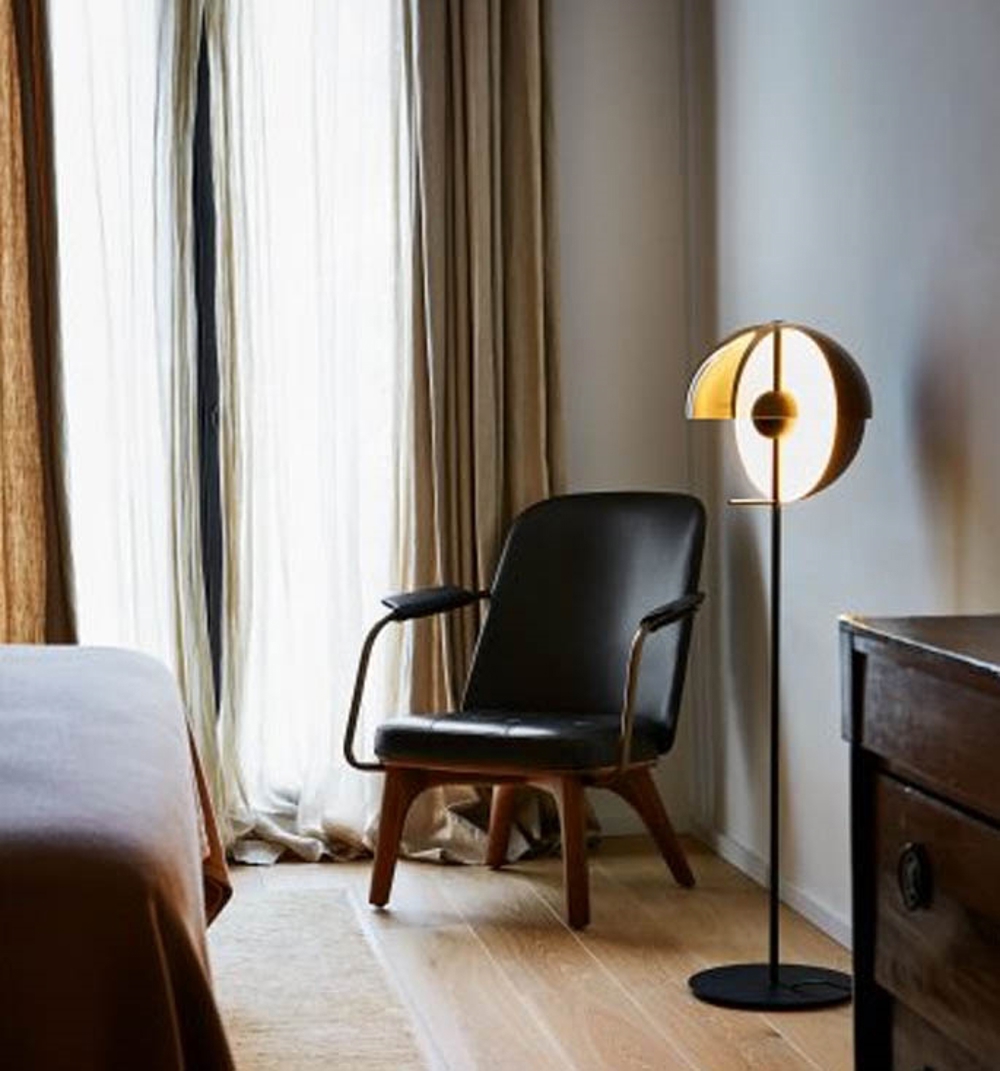Theia P, czarna lampa podłogowa od Marset, zaprojektowana przez Mathiasa Hahna.