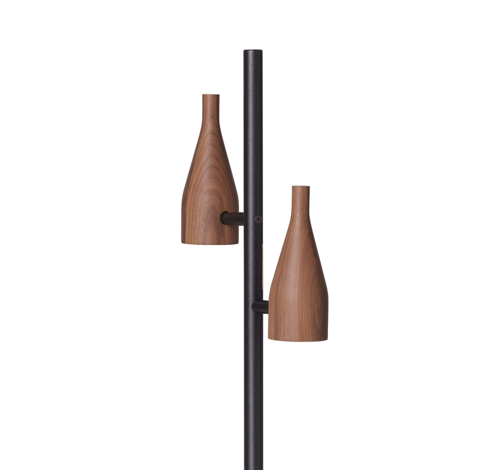 Lounge Double z serii Timber to lampa podłogowa z dwoma ruchomymi reflektorami, co czyni ją użyteczną jako lampa do czytania.