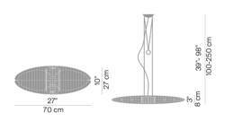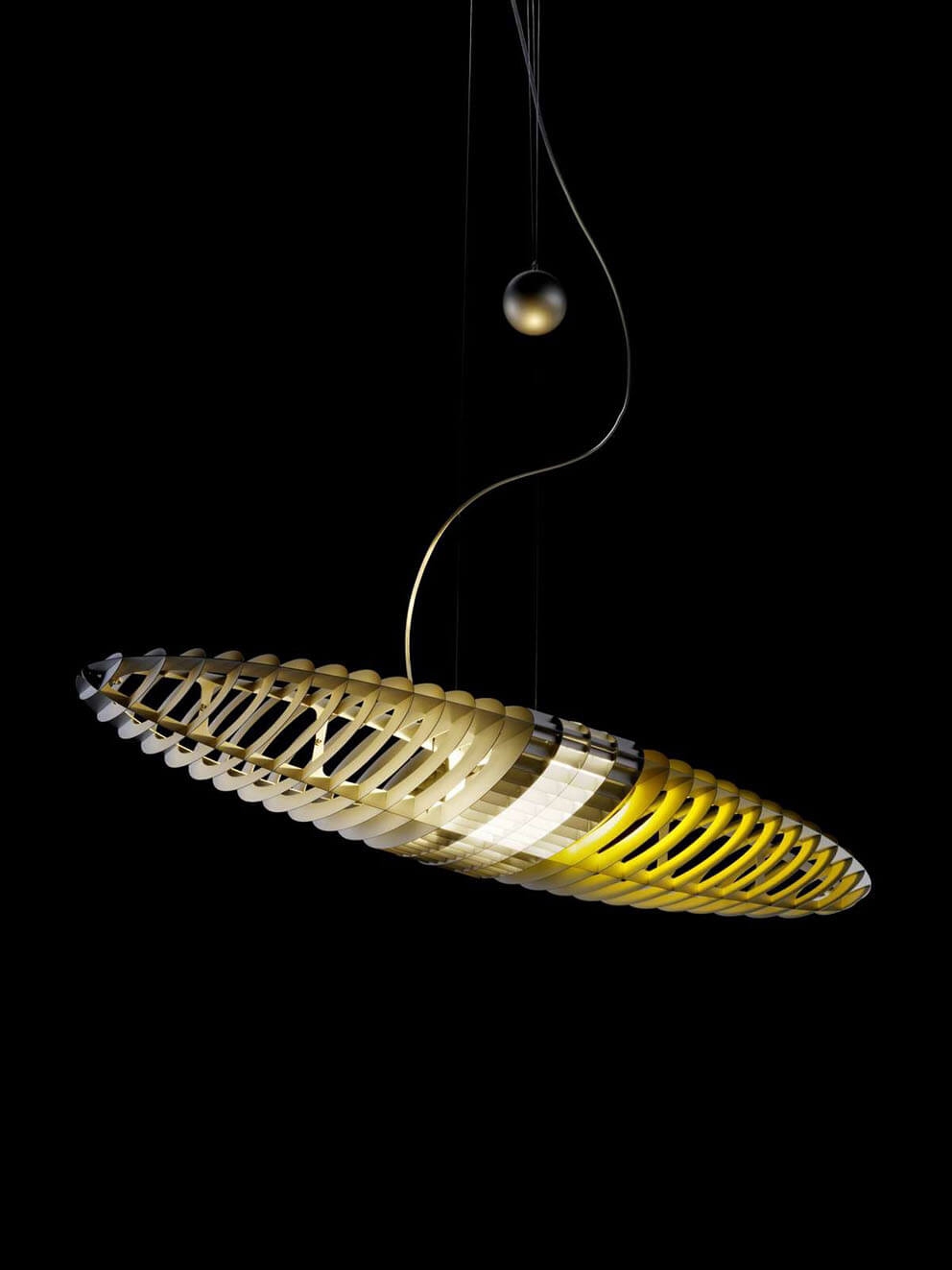 Titania lampa wisząca to eleganckie połączenie funkcji i designu dzięki swojej eliptycznej formie. Światło pięknie odbija się przez przezroczysty klosz z aluminiowymi lamelami, które jednocześnie ukrywają żarówkę. Przeciwwaga między kloszem a sufitem pozwala na regulację wysokości klosza, a dołączone filtry z poliwęglanu w kolorach żółtym, różowym, jasnoniebieskim i fioletowym umożliwiają zmianę koloru lampy wiszącej bez zmiany białego światła lampy.