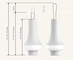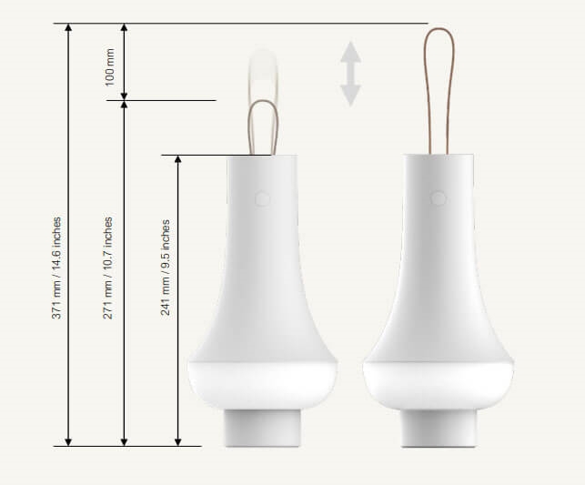 Lampa bateryjna ma matowe wykończenie i jest wyposażona w skórzany pasek, który można dodatkowo wysunąć, dzięki czemu lampę można łatwo zabrać ze sobą lub powiesić. Przenośna lampa ma zarówno płynną, jak i 4-stopniową regulację jasności (5%, 20%, 45%, 100%). Może świecić 5,5 godziny przy jasności 100 procent, 15 godzin przy 45%, 38 godzin przy 20% i 48 godzin przy 5% i łatwo się ładuje za pomocą dołączonego kabla USB.