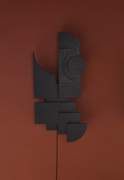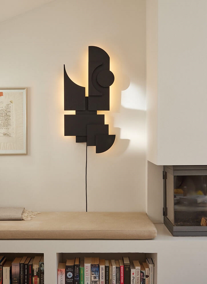 Skulpturalny kinkiet Totem Deco łączy zabawne geometryczne formy z praktyczną funkcjonalnością. Lampa włącza się i wyłącza poprzez obrót okrągłego elementu, który również działa jako ściemniacz. Kreatywny design kinkietu wykonany jest z MDF z lakierowanym fornirem dębowym, a interakcja między ostrymi liniami a miękkimi krzywiznami tworzy piękną grę światła, gdy lampa jest włączona.