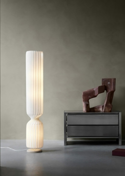 Klosz lampy wiszącej jest zmontowany z kawałkiem drewna brzozowego na górze, podobnie jak lampa podłogowa stoi na podstawie z drewna brzozowego, co nadaje serii wyrazisty rzeźbiarski wygląd z ciepłym i naturalnym akcentem.