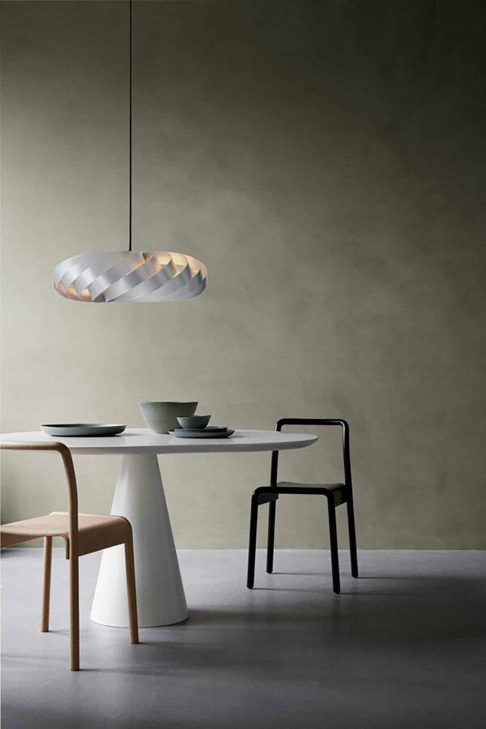 Piękny pendel ma skręcony kształt, który rozprasza światło we wszystkich kierunkach, jednocześnie osłaniając źródło światła. To zarówno przytulna, jak i funkcjonalna lampa, wykonana z doskonałym rzemiosłem. Lampa jest niezbędna do zawieszenia nad stołem jadalnym lub kuchennym i można ją łatwo łączyć z innymi Tom Rossau pendelami.