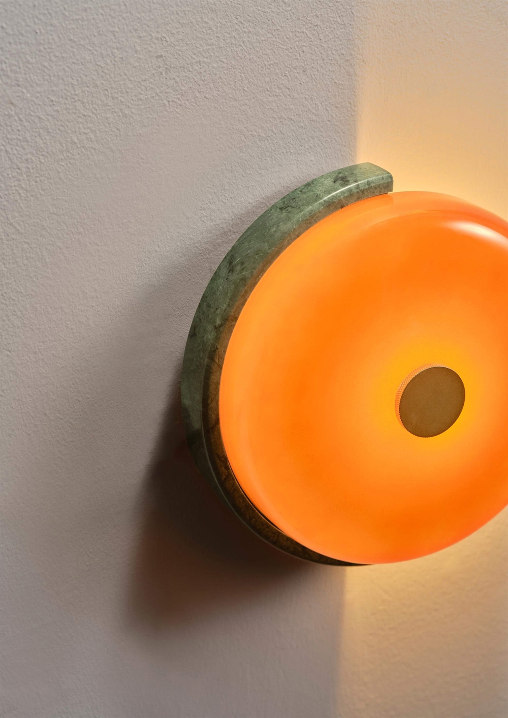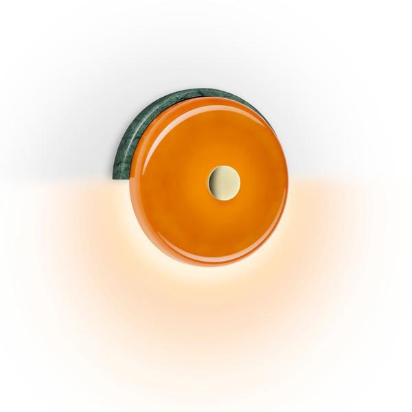 Kinkiet TRIP ma rzeźbiarski wyraz z prostym designem w pięknych i klasycznych materiałach. Lampa składa się z okrągłego klosza z dmuchanego szkła, podstawy z polerowanego marmuru wyciętej w półkole oraz detalu z mosiądzu. Światło z diody LED rozprzestrzenia się elegancko z klosza, tworząc miękką i przyjemną atmosferę w pomieszczeniu.