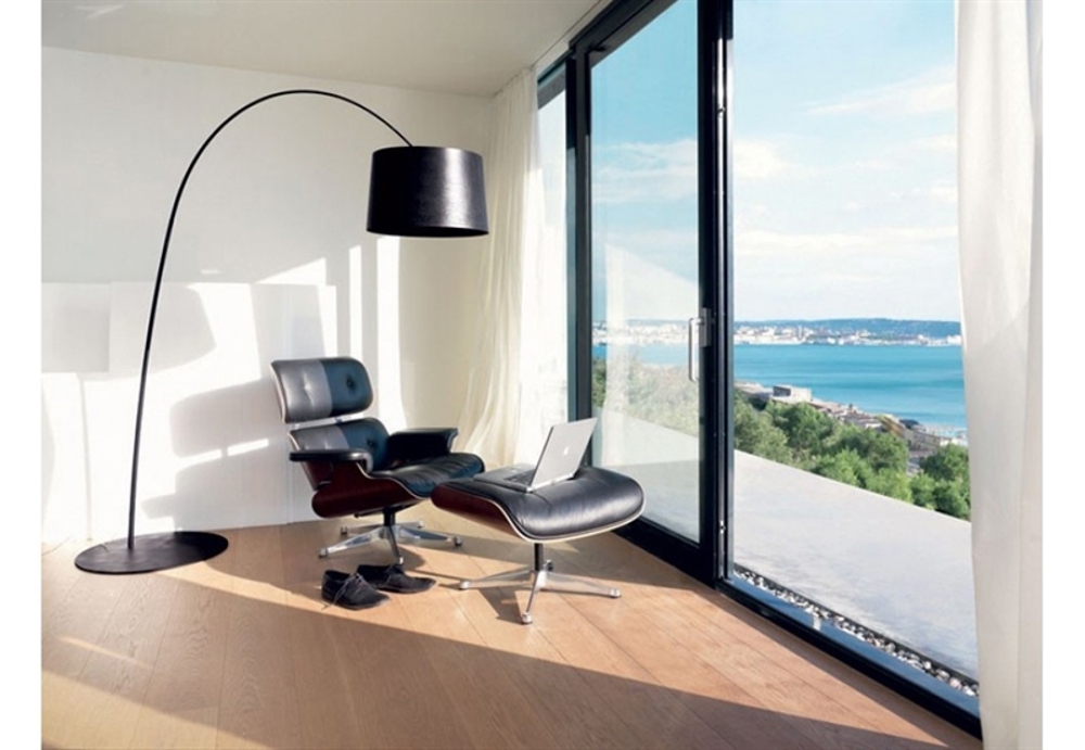 Nowoczesna i elegancka lampa stojąca z podstawą z lakierowanego metalu i kloszem z włókna szklanego. Klosz wyposażony jest w matowy wewnętrzny ekran, który zapewnia przyjemne, nieoślepiające światło.