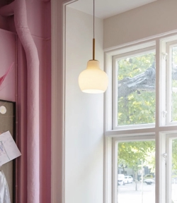 VL Ringkrone emituje przyjemne i ciepłe światło, które pasuje do każdego wnętrza. Klosz wykonany jest z dmuchanego szkła opalowego w trzech warstwach z zawieszeniem i baldachimem z nieobrobionego polerowanego mosiądzu, który z czasem nabierze patyny. Pendel dostępny jest z jednym, trzema, pięcioma lub siedmioma kloszami.