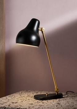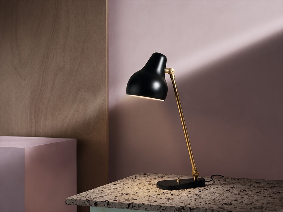 Lampa stołowa VL38 ma niezwykle funkcjonalny design, w którym klosz można regulować w zależności od potrzeb. Oprawa emituje bezpośrednie i kierunkowe światło, a dzięki białemu lakierowanemu wnętrzu klosza lampa daje bardzo przyjemne światło.